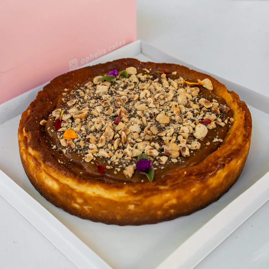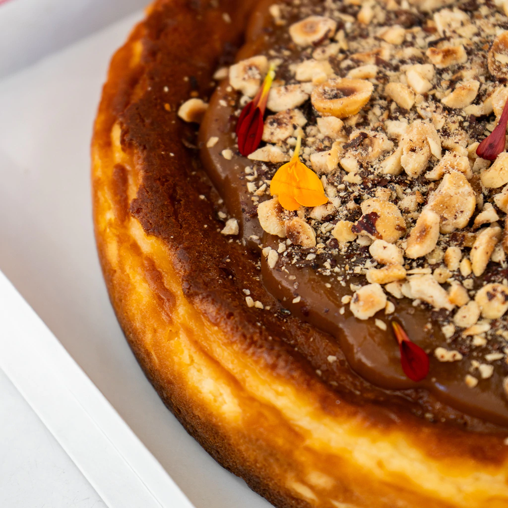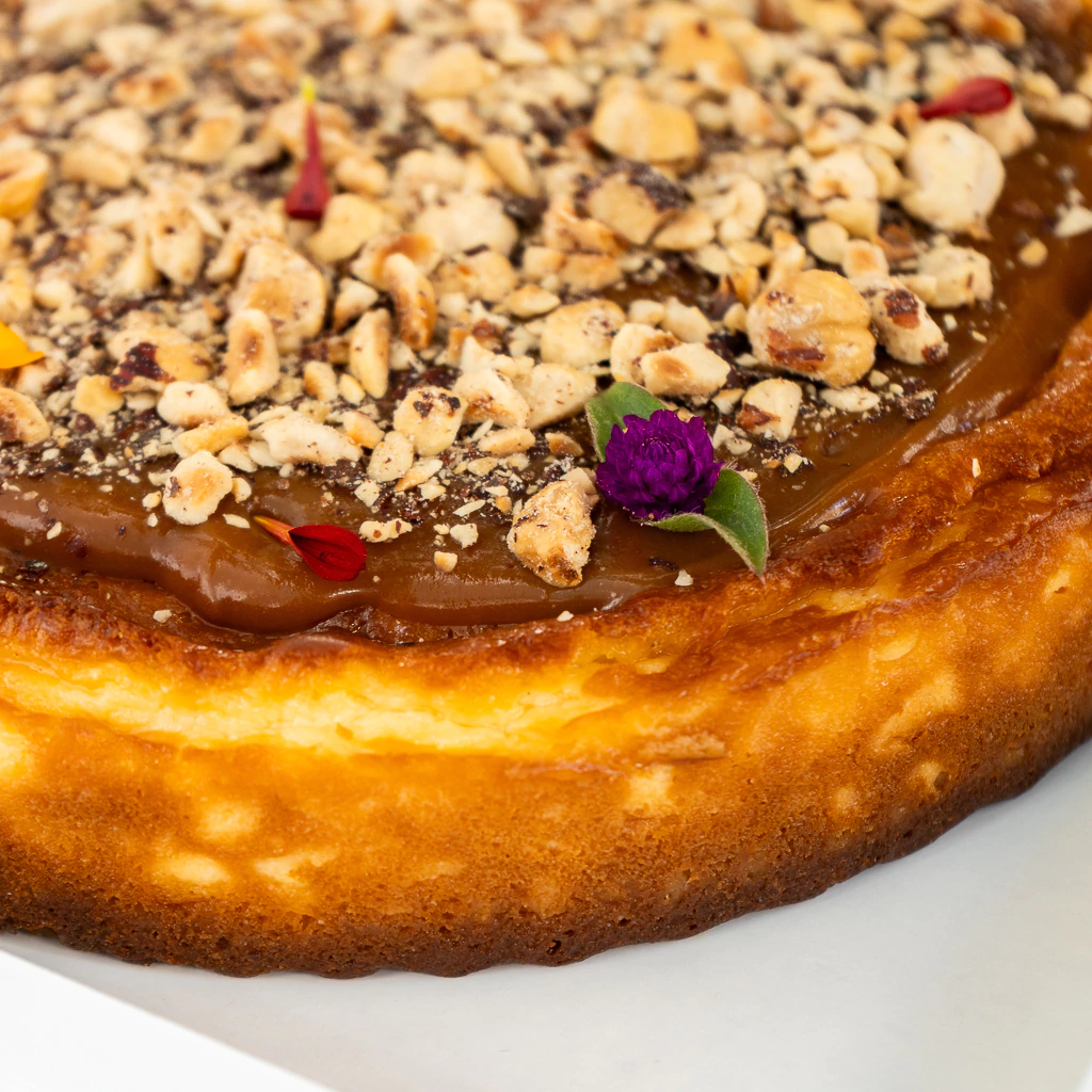Base de galletitas , cheesecake estilo New York , salsa toffee y avellanas tostadas.