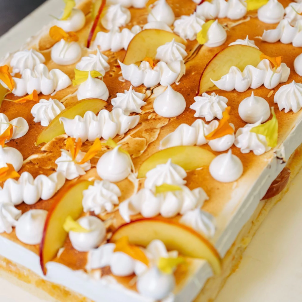 una capa fina de flan de 3 leches + pelones cocidos en un almíbar de naranja y canela , una mezcla espectacular . Todo esto coronado con merengue italiano y la magia de siempre para poner lindas nuestras tortas.