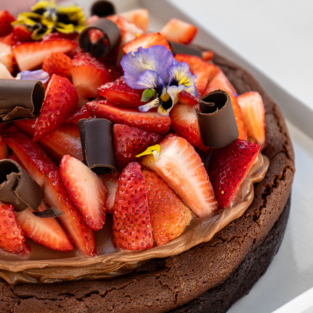 Base de marquise (no contiene harina), dulce de leche, mousse de chocolate con leche y frutillas.