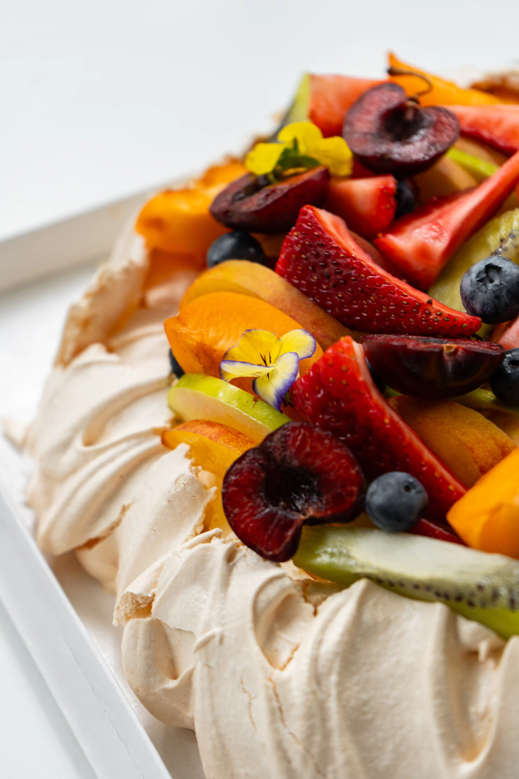 Base de pavlova + curd de limón + crema chantilly + fruta de estación.